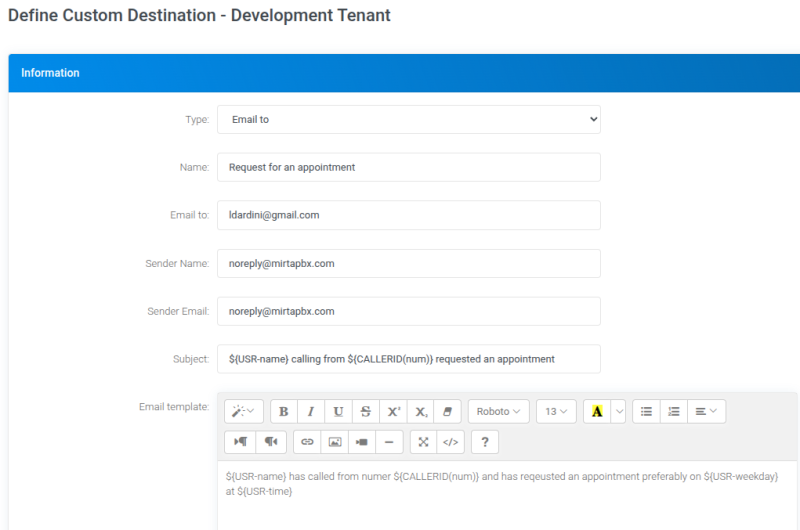 Before going live, connecting the Custom Destination to a DID or IVR menu entry, you can test the configuration in the bottom text box, using text.