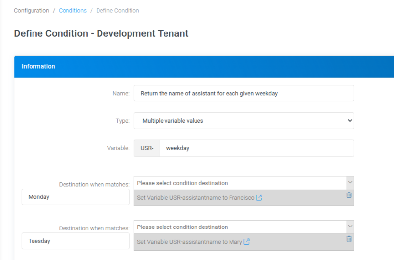 Talking and giving information for the IA is an easy job, but let's put the IA to do some real work. In this case we want to use the IA to book an appointment, so when an appointment is requested, we are going to instruct the IA to ask for the weekday and the time for the appointment. This is the result of the configuration:
