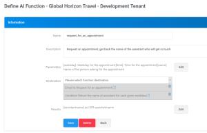 This configuration is made by pressing the "Function" edit icon. It is important to describe each function, so the IA can pick the correct one based on the requests from the caller. It is of the same importance to describe each of the parameters. The names of the parameters, "name", "weekday" and "time" will be available in Asterisk as variables like USR-name, USR-weekday and USR-time, so you can use them in your configuration.
